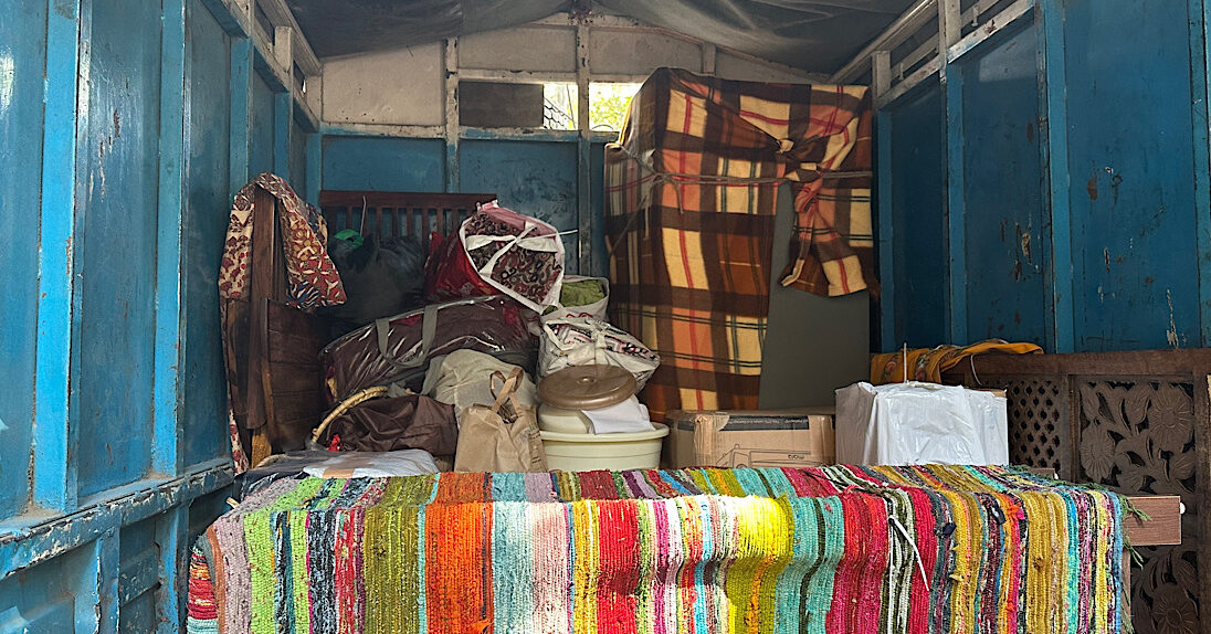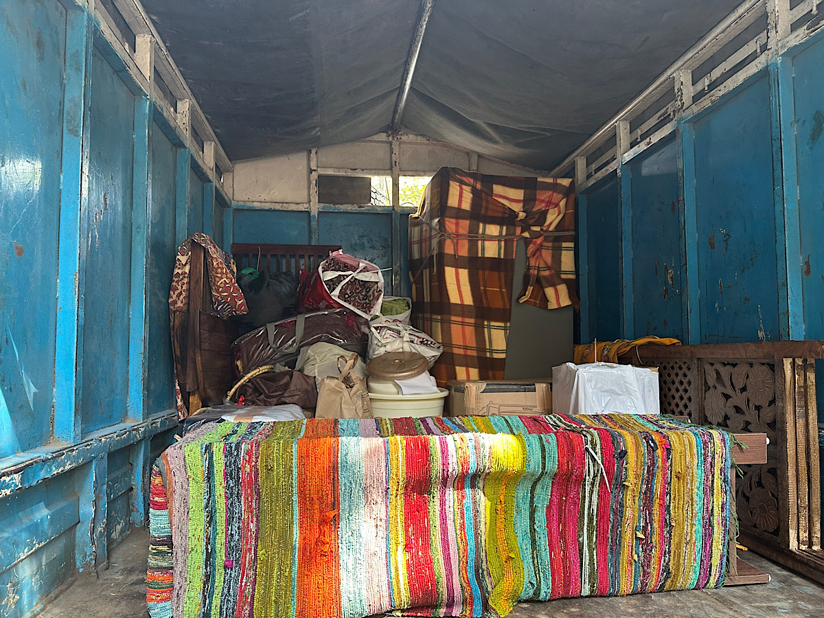 往復トラックの手配、到着後の荷物の保管は、引取先の先方がしてくれる手筈となっていたため、私は手持ちの段ボールやら不織布袋などあるものだけを使って自分の荷物をすべて梱包し当日まで待機。一部の衣類なんかは袋から見えていたりもする雑な梱包でしたが、なくなったらなくなった時の精神で。どうしてもなくなったら困るものは帰国用スーツケースに確保。